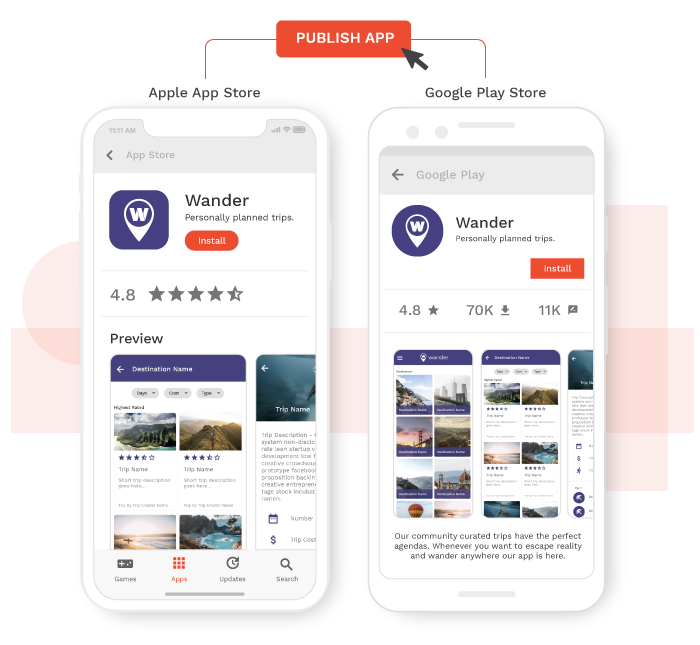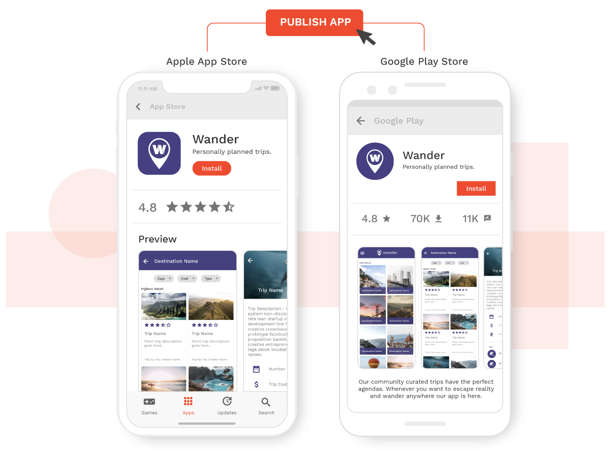 With one click you can launch a truly native version of your app on the app stores for both iOS and Android.
